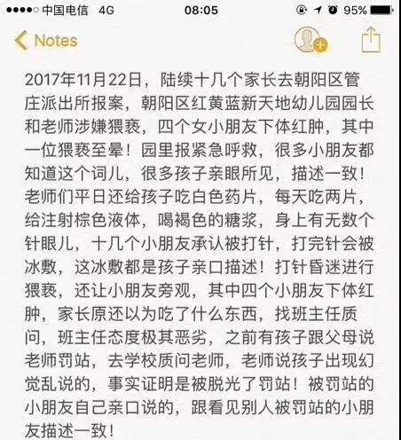 據有關消息,北京朝陽區紅黃藍幼兒園被曝出群體猥褻幼兒,出現給孩子喂不明白色藥片,喝褐色糖漿、脫光衣服體罰等虐待兒童行為。