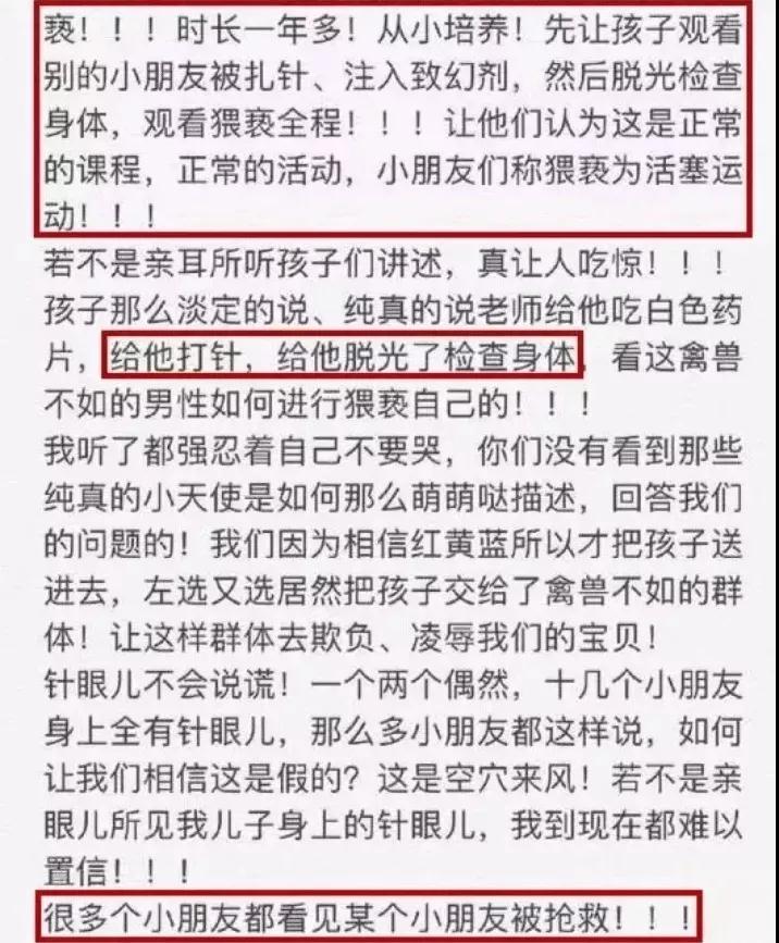 從上述的圖片中,我們可以整理出來,這并不是一場個別教師心理扭曲的變態虐童行為,而是一場有組織有規模有目的群體虐童行為!