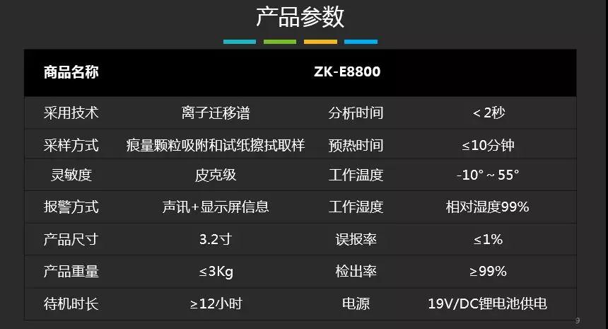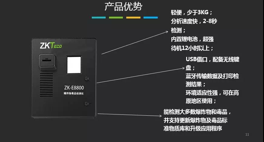 便攜式爆炸物毒品探測(cè)儀ZK-E8800是由中控門(mén)禁自主研發(fā)、生產(chǎn)的爆炸物和毒品檢查設(shè)備。該產(chǎn)品基于國(guó)際上先進(jìn)的離子遷移譜(IMS)技術(shù)原理,能夠快速、精準(zhǔn)地檢測(cè)并判斷痕量爆炸物及毒品的種類(lèi),具有快速、準(zhǔn)確地檢測(cè)痕量爆炸物、毒品的功能,產(chǎn)品性能達(dá)到同類(lèi)產(chǎn)品國(guó)際先進(jìn)水平,具有易于使用,耗材成本低和維護(hù)方便等優(yōu)勢(shì)。