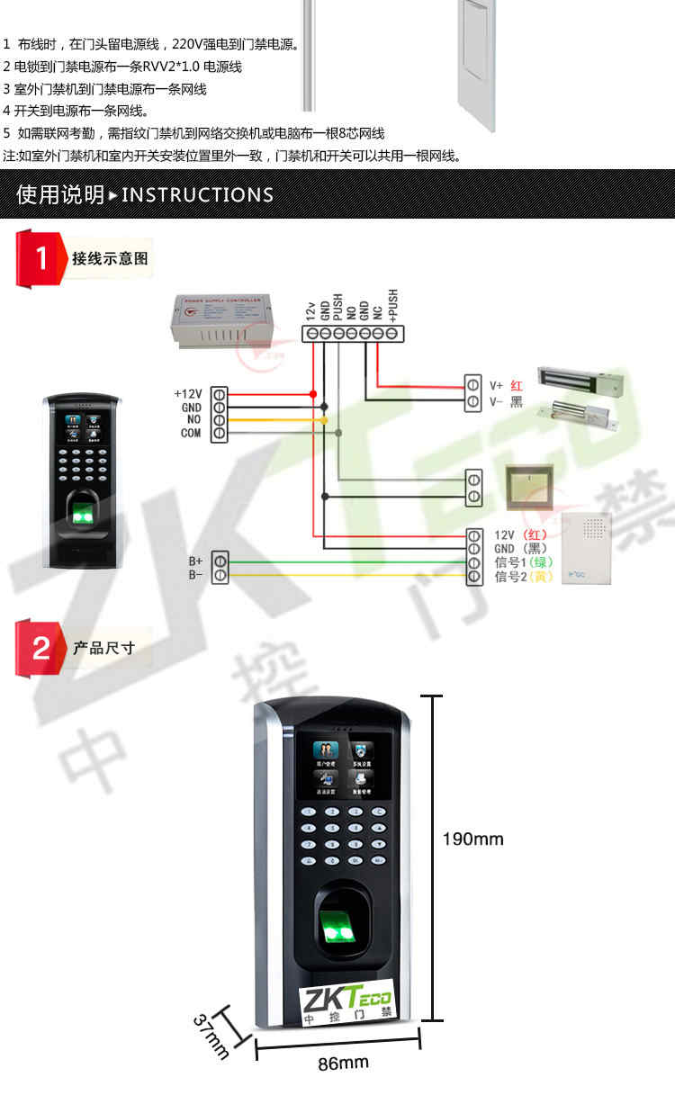 安裝和使用異常簡單,連線、電鎖控制等和IC/ID卡門禁系統一樣,具備指紋液晶提示每一步操作,您基本不需要說明書都可以進行設置和管理。拋棄了一般指紋設備復雜的操作,而且F7指紋門禁的操作和使用都不需要依賴于電腦,可以獨立設置和運行。
